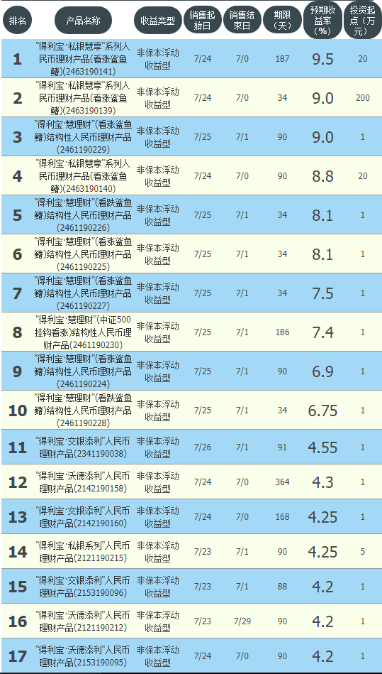 今日交通银行在售银行理财产品收益最高为“得利宝·私银慧享系列人民币理财产品(看涨鲨鱼鳍)(2463190141)”,该款产品理财期限为187天,最高预期收益为9.5%,投资起点为20万元,该款产品7月24日-7月0日面向全国发售。