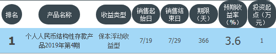 今日邮政储蓄银行在售银行理财产品收益最高为“个人人民币结构性存款产品2019年第4期”,该款产品理财期限为366天,最高预期收益为3.6%,投资起点为1万元,该款产品7月19日-7月29日面向全国发售。