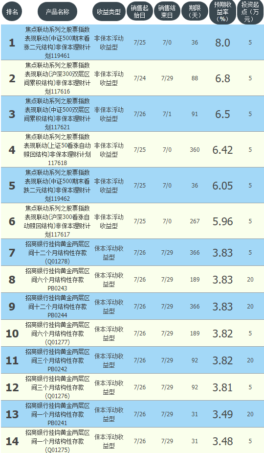 今日招商银行在售银行理财产品收益最高为“焦点联动系列股票指数表现联动(中证500期末看涨二元结构)非保本理财计划119461”,该款产品理财期限为36天,最高预期收益为8.0%,投资起点为5万元,该款产品7月25日-7月0日面向全国发售。