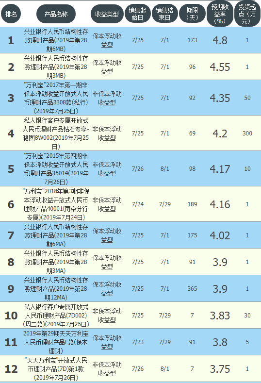 今日兴业银行在售银行理财产品收益最高为“兴业银行人民币结构性存款理财产品(2019年第28期6MB)”,该款产品理财期限为173天,最高预期收益为4.8%,投资起点为1万元,该款产品7月25日-7月1日面向全国发售。