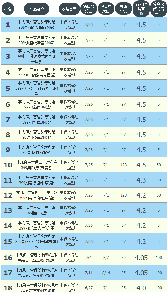 今日民生银行在售银行理财产品收益最高为“非凡资产管理季增利第399期(直销加喜3M)款”,该款产品理财期限为97天,最高预期收益为4.5%,投资起点为5万元,该款产品7月26日-7月1日面向全国发售。