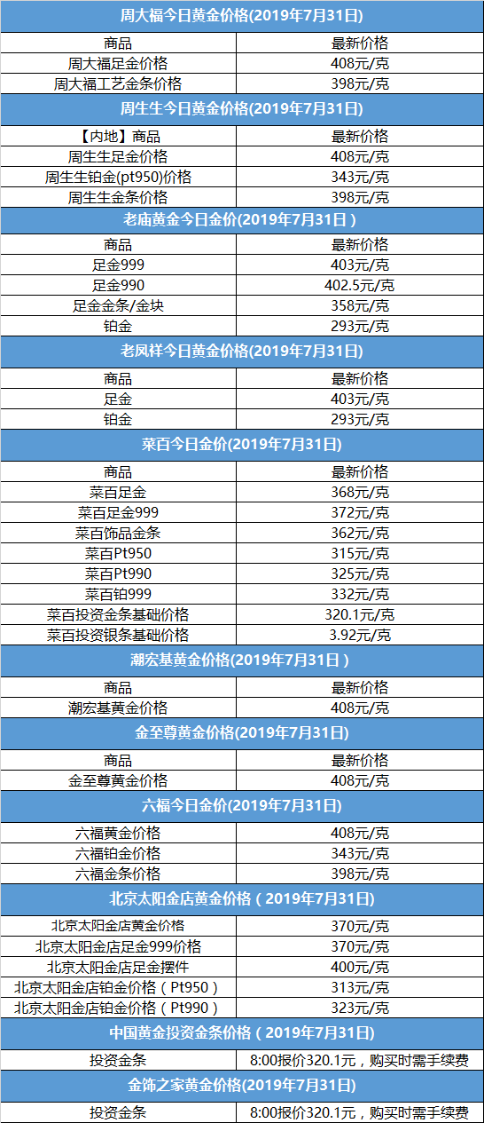 2019年7月31日今日黄金价格今天多少一克查询包括:周生生/周大福/六福珠宝/老庙黄金/老凤祥/菜百/太阳金店/潮宏基/金至尊黄金首饰价格查询。