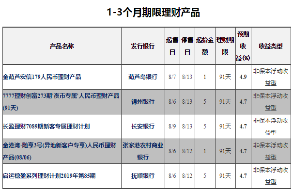 1-3个月银行理财中(非结构性)收益排名第一的为葫芦岛银行——金葫芦宏信179人民币理财产品,预期最高收益率为4.9%。销售起始日:2019-08-07;销售截止日:2019-08-13;理财期限:91天;发行地区:葫芦岛,沈阳,营口。
