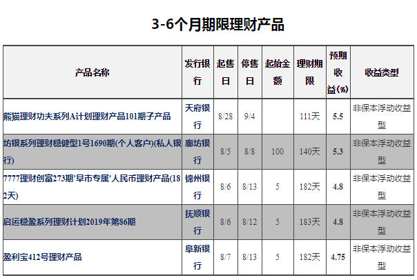 3-6个月银行理财中(非结构性)收益排名第一的为天府银行——熊猫理财功夫系列A计划理财产品101期子产品,预期最高收益率为5.5%。销售起始日:2019-08-28;销售截止日:2019-09-04;理财期限:111天。