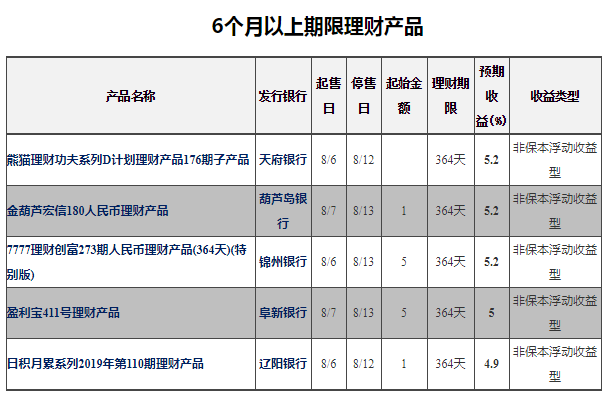 6个月及以上银行理财(非结构性)中收益排名第一的天府银行——熊猫理财功夫系列D计划理财产品176期子产品,预期最高收益率为5.2%。销售起始日:2019-08-06;销售截止日:2019-08-12;理财期限:364天。