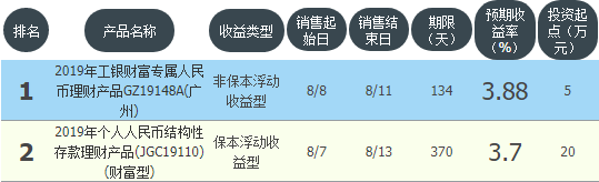 今日工商银行在售银行理财产品收益最高为“工银财富专属人民币理财产品GZ19148A(广州)”,该款产品理财期限为134天,最高预期收益为3.88%,投资起点为5万元,该款产品8月8日-8月11日面向广州发售。