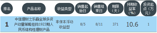 今日中信银行在售银行理财产品收益最高为“中信理财之乐赢全球多资产动量策略挂钩1923期人民币结构性理财产品”,该款产品理财期限为371天,最高预期收益为10.6%,投资起点为1万元,该款产品8月5日-8月11日面向全国发售。