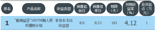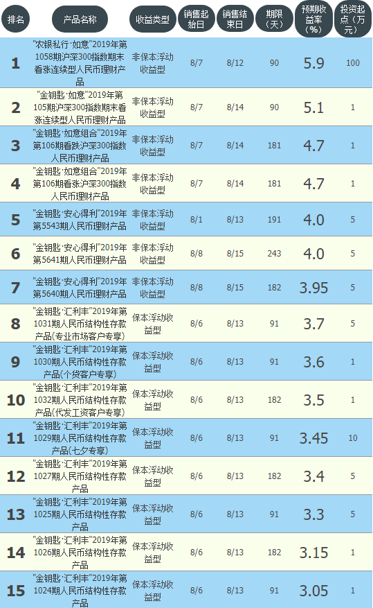 今日农业银行在售银行理财产品收益最高为“农银私行·如意2019年第1058期沪深300指数期末看涨连续型人民币理财产品”,该款产品理财期限为90天,最高预期收益为5.9%,投资起点为100万元,该款产品8月7日-8月12日面向全国发售。