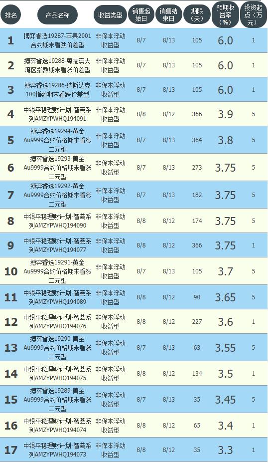 今日中国银行在售银行理财产品收益最高为“搏弈睿选19287-苹果2001合约期末看跌价差型”,该款产品理财期限为105天,最高预期收益为6.0%,投资起点为1万元,该款产品8月7日-8月13日面向全国发售。