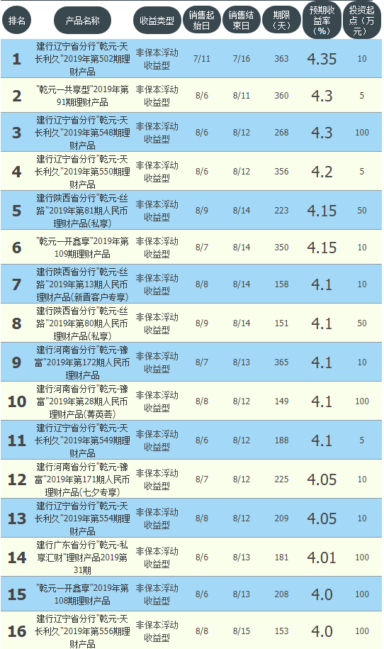 今日建设银行在售银行理财产品收益最高为“建行辽宁省分行乾元-天长利久2019年第502期理财产品”,该款产品理财期限为363天,最高预期收益为4.35%,投资起点为10万元,该款产品8月11日-8月16日面向辽宁发售。