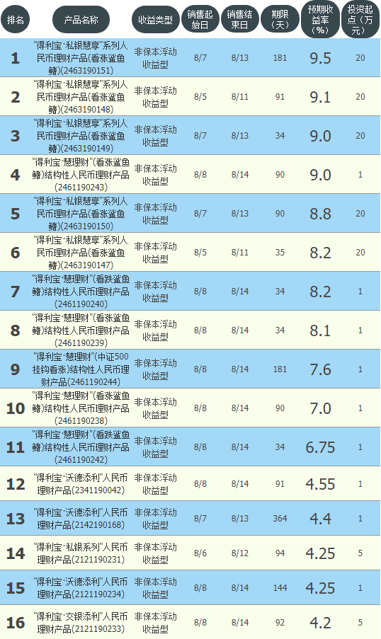 今日交通银行在售银行理财产品收益最高为“得利宝·私银慧享系列人民币理财产品(看涨鲨鱼鳍)(2463190151)”,该款产品理财期限为181天,最高预期收益为9.5%,投资起点为20万元,该款产品8月7日-8月13日面向全国发售。