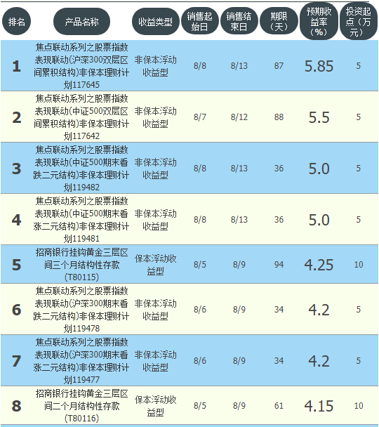 今日招商银行在售银行理财产品收益最高为“焦点联动系列股票指数表现联动(沪深300双层区间累积结构)非保本理财计划117645”,该款产品理财期限为87天,最高预期收益为5.85%,投资起点为5万元,该款产品8月8日-8月13日面向全国发售。