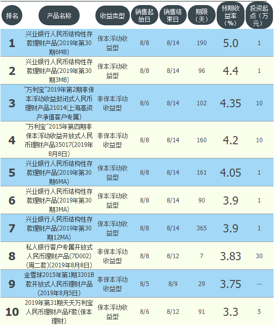 今日兴业银行在售银行理财产品收益最高为“兴业银行人民币结构性存款理财产品(2019年第30期6MB)”,该款产品理财期限为190天,最高预期收益为5.0%,投资起点为1万元,该款产品8月8日-8月14日面向全国发售。