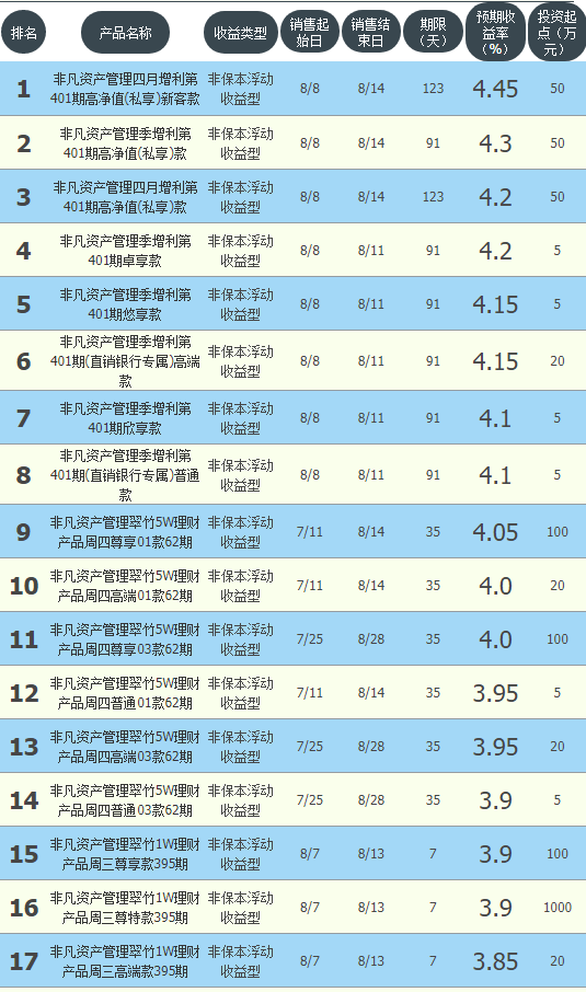 今日民生银行在售银行理财产品收益最高为“非凡资产管理四月增利第401期高净值(私享)新客款”,该款产品理财期限为123天,最高预期收益为4.45%,投资起点为50万元,该款产品8月8日-8月14日面向全国发售。