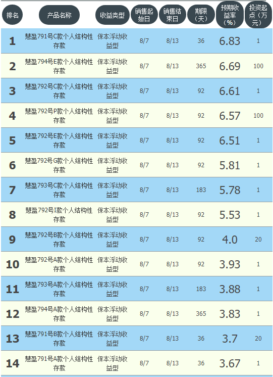 今日华夏银行在售银行理财产品收益最高为“慧盈791号C款个人结构性存款”,该款产品理财期限为36天,最高预期收益为6.83%,投资起点为1万元,该款产品8月7日-8月13日面向全国发售。