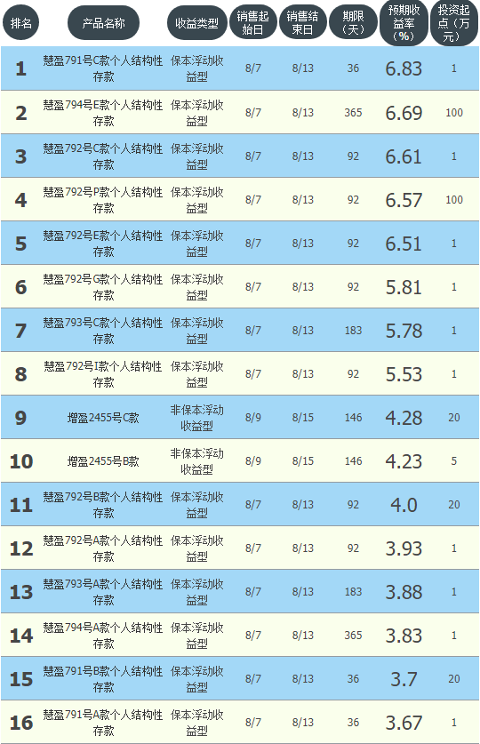 今日华夏银行在售银行理财产品收益最高为“慧盈791号C款个人结构性存款”,该款产品理财期限为36天,最高预期收益为6.83%,投资起点为1万元,该款产品8月7日-8月13日面向全国发售。