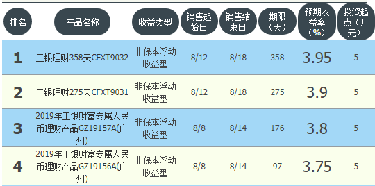 今日工商银行在售银行理财产品收益最高为“工银理财358天CFXT9032”,该款产品理财期限为358天,最高预期收益为3.95%,投资起点为5万元,该款产品8月12日-8月18日面向全国发售。