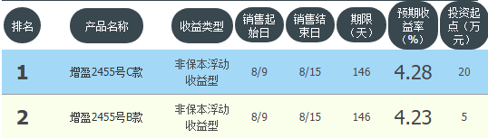 今日华夏银行在售银行理财产品收益最高为“增盈2455号C款”,该款产品理财期限为146天,最高预期收益为4.28%,投资起点为20万元,该款产品8月9日-8月15日面向全国发售。