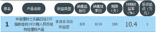 今日中信银行在售银行理财产品收益最高为“中信理财之乐赢日经225指数挂钩1931期人民币结构性理财产品”,该款产品理财期限为186天,最高预期收益为10.4%,投资起点为1万元,该款产品8月8日-8月14日面向全国发售。