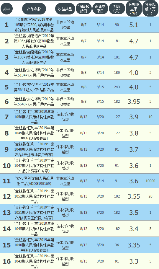 今日农业银行在售银行理财产品收益最高为“金钥匙·如意2019年第105期沪深300指数期末看涨连续型人民币理财产品”,该款产品理财期限为90天,最高预期收益为5.1%,投资起点为1万元,该款产品8月7日-8月14日面向全国发售。