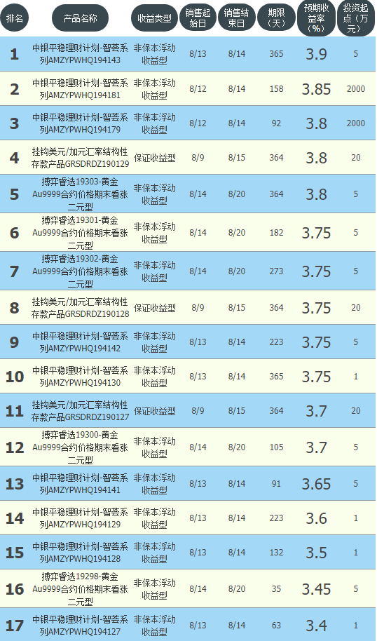 今日中国银行在售银行理财产品收益最高为“中银平稳理财计划-智荟系列AMZYPWHQ194143”,该款产品理财期限为365天,最高预期收益为3.9%,投资起点为5万元,该款产品8月13日-8月14日面向全国发售。