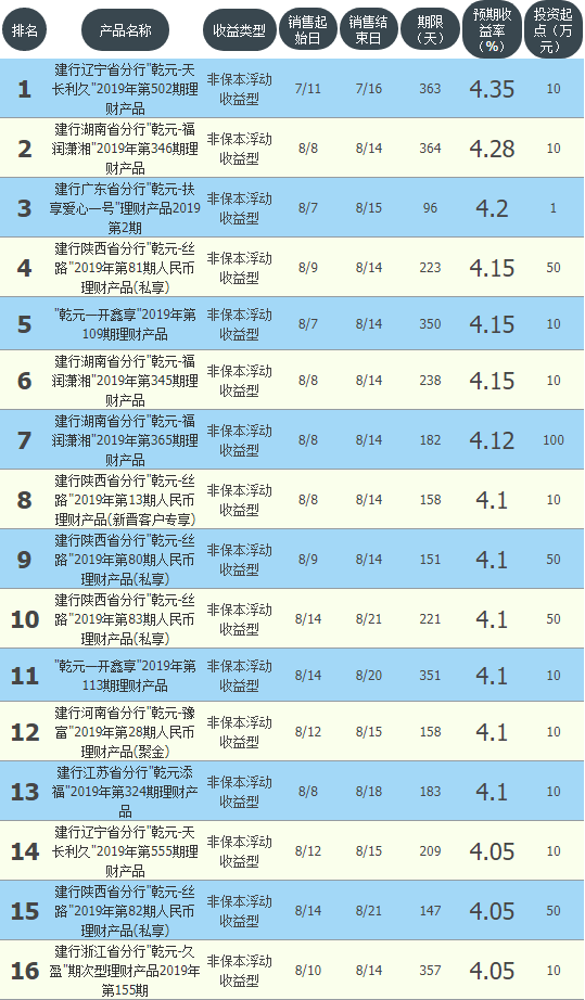 今日建设银行在售银行理财产品收益最高为“建行辽宁省分行乾元-天长利久2019年第502期理财产品”,该款产品理财期限为363天,最高预期收益为4.35%,投资起点为10万元,该款产品8月11日-8月16日面向辽宁发售。