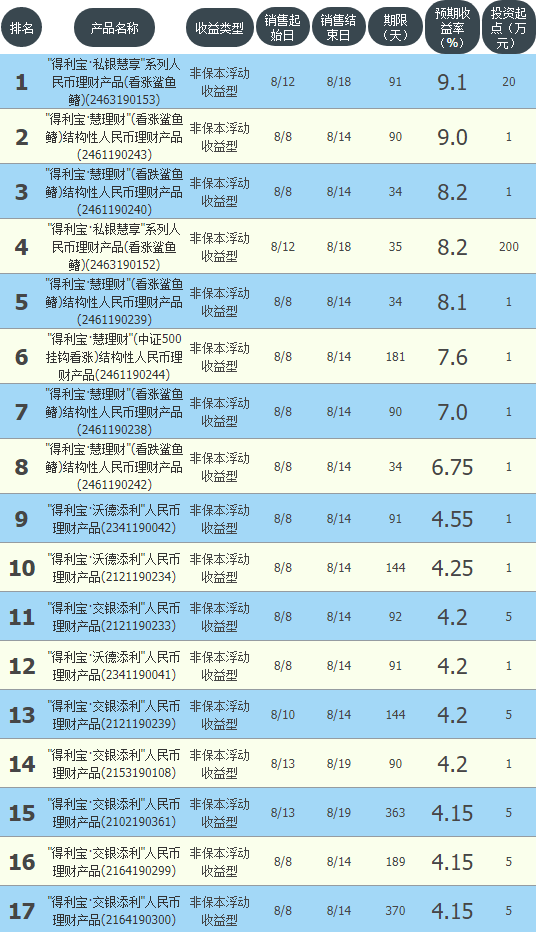 今日交通银行在售银行理财产品收益最高为“得利宝·私银慧享系列人民币理财产品(看涨鲨鱼鳍)(2463190153)”,该款产品理财期限为91天,最高预期收益为9.1%,投资起点为20万元,该款产品8月12日-8月18日面向全国发售。