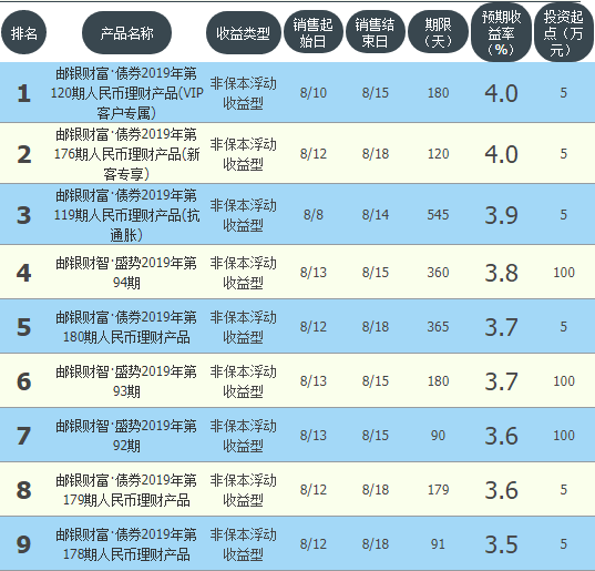 今日邮政储蓄银行在售银行理财产品收益最高为“邮银财富·债券2019年第120期人民币理财产品(VIP客户专属)”,该款产品理财期限为180天,最高预期收益为4.0%,投资起点为5万元,该款产品8月10日-8月15日面向全国发售。