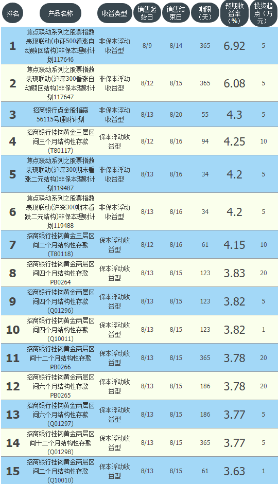 今日招商银行在售银行理财产品收益最高为“焦点联动系列股票指数表现联动(中证500看涨自动赎回结构)非保本理财计划117646”,该款产品理财期限为365天,最高预期收益为6.92%,投资起点为5万元,该款产品8月9日-8月14日面向全国发售。