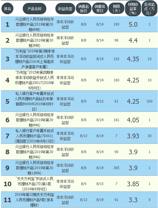 今日兴业银行在售银行理财产品收益最高为“兴业银行人民币结构性存款理财产品(2019年第30期6MB)”,该款产品理财期限为190天,最高预期收益为5.0%,投资起点为1万元,该款产品8月8日-8月14日面向全国发售。