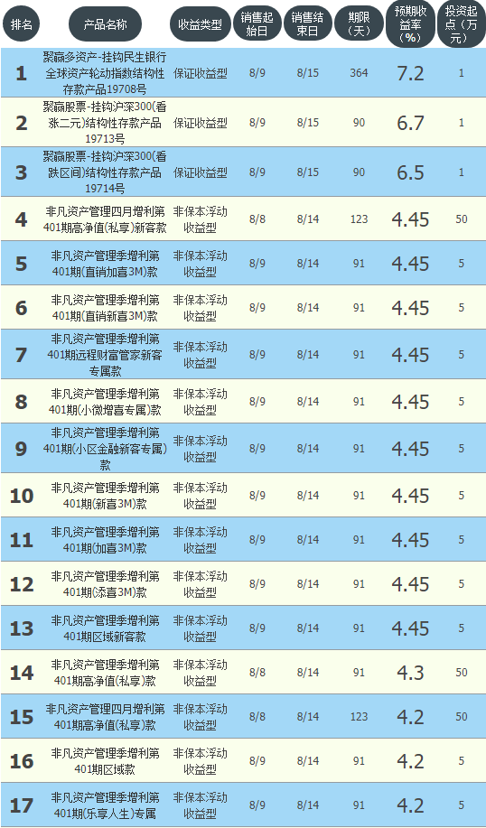 今日民生银行在售银行理财产品收益最高为“聚赢多资产-挂钩民生银行全球资产轮动指数结构性存款产品19708号”,该款产品理财期限为364天,最高预期收益为7.2%,投资起点为1万元,该款产品8月9日-8月15日面向全国发售。