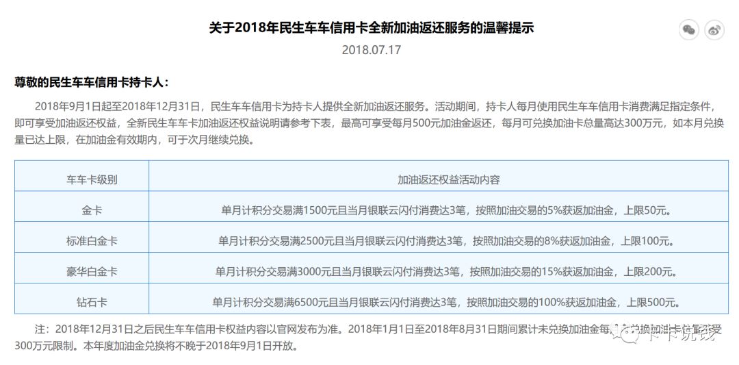 7月17日,民生银行发布公告《关于2018年民生车车信用卡全新加油返还服务的温馨提示》。
