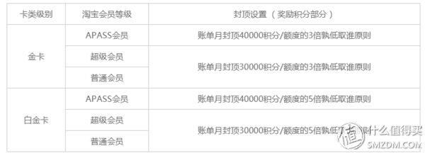 积分上限的表贴一下供参考,反正我们这种正常消费,从未到过封顶。另外提示下封顶积分30000指的是奖励积分封顶,中信淘气卡默认的是支付宝2倍积分,也就是说平日普通会员是一倍奖励积分,超级会员是两倍奖励积分,超过封顶值,原始消费积分还是有的。