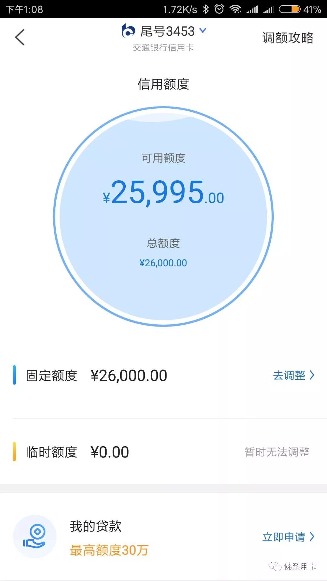 大家好,我是有爱的分享经验卡友,今天分享一下我交通提额的经验,交通16K的额度,很久了,一直放着大概2年了吧,(交通的提额方法相信大家都知道,就是冷冻...)闲来无事打开买单吧提额,发现可以提额度了,顺便点一下,看到额度提到了26k,欣喜若狂啊~赶紧提!~