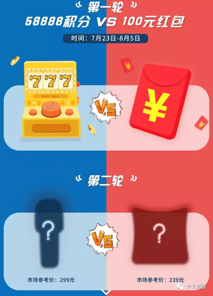 你可以选择要58888积分还是要100元红包,分属两个不同团队。假设最终选择100元红包的团队刷卡消费总金额较高,则该团队消费金额前30000名获得100元红包奖励。