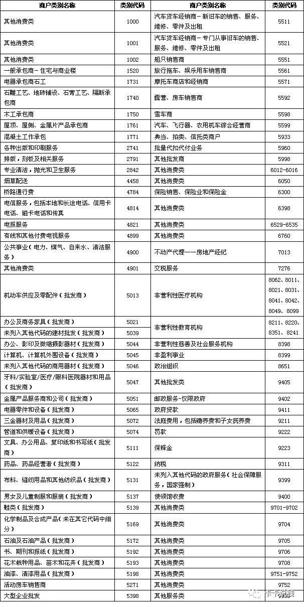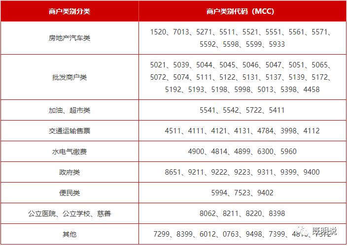 在房地产类商户、各种机动车商户、飞行器类商户、批发类商户、保险类商户、烟草配送类商户的消费;