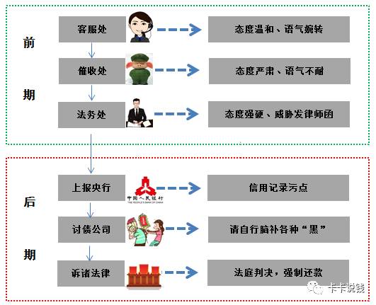 有的朋友卡片逾期之后,也不晓得银行的催收程序,下图表格大家可作为参考。