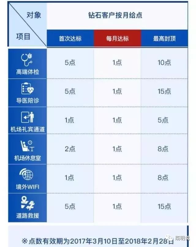 权益采用积点形式,每年3月10号到次年2月28号为一个积点有效期年度,如2017年度指2017年3月10日至2018年2月28日。每月可得点数将于次月第七个工作日完成充值工作,具体的积点计算方式如下: