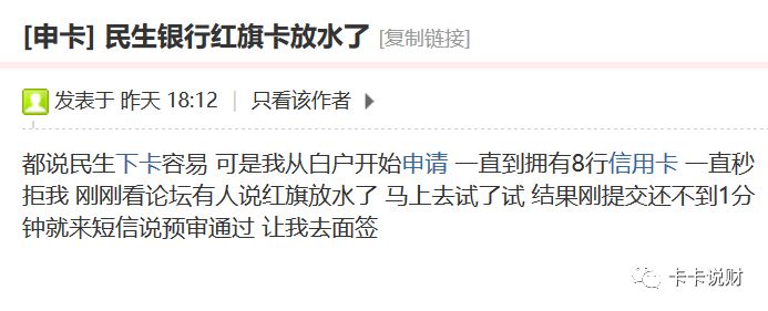 前段时候,有传闻民生新卡蓝精灵放水,虽然新卡没什么权益,但是冲着放水,很多长期无法拿下民生的卡友,也去申请了一张。