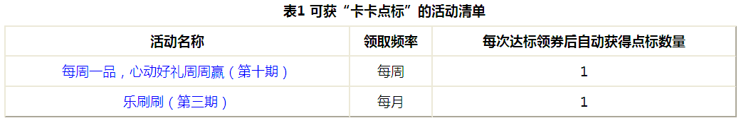 活动期间,客户参与下述“表1”中指定农行信用卡活动,按指定活动的要求,达标且成功登录掌银领取该活动幸运券码,即可自动获得相应数量的“卡卡点标”(以下简称“点标”)。活动期间收集指定数量点标的客户,可于每月指定时间以6积分参与专场礼品抢兑。