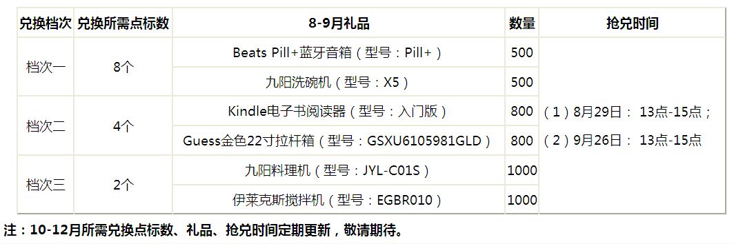 2、客户根据自己持有的点标数量,可自行选择兑换相应档次下的任一礼品。客户持有8个及以上点标,则仅可选择兑换“档次一”下的任一礼品;客户持有点标数量大于等于4个但小于8个,则仅可选择兑换“档次二”下的任一礼品;客户持有点标数量大于等于2个但小于4个,则仅可选择兑换“档次三”下的任一礼品。每期兑奖每名客户仅可兑换1个礼品,不可降档兑换,不可同时参加两个及两个以上档次的兑换。