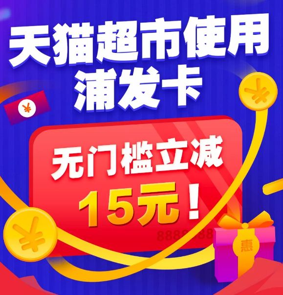 浦发卡(信用卡/借记卡)持卡人在天猫超市购物,订单满15.01元,立减15元优惠,同一持卡人在活动期间最多可以各享受1次借记卡与信用卡的立减优惠,每次参与最高减15元,名额有限,先到先得。