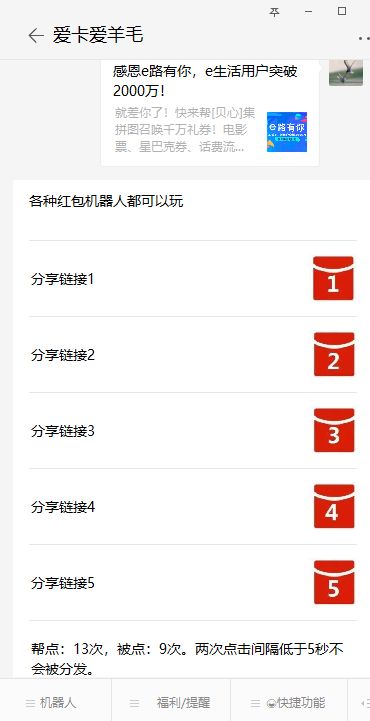 和浦发红包流程类似,先分享给自己或者文件传输助手,然后收藏,打开爱卡爱羊毛公众号,从我的收藏里找到刚才的收藏,发送之后,会给你返回5个别人的链接,帮助别人之后,你的链接才会被别人点。