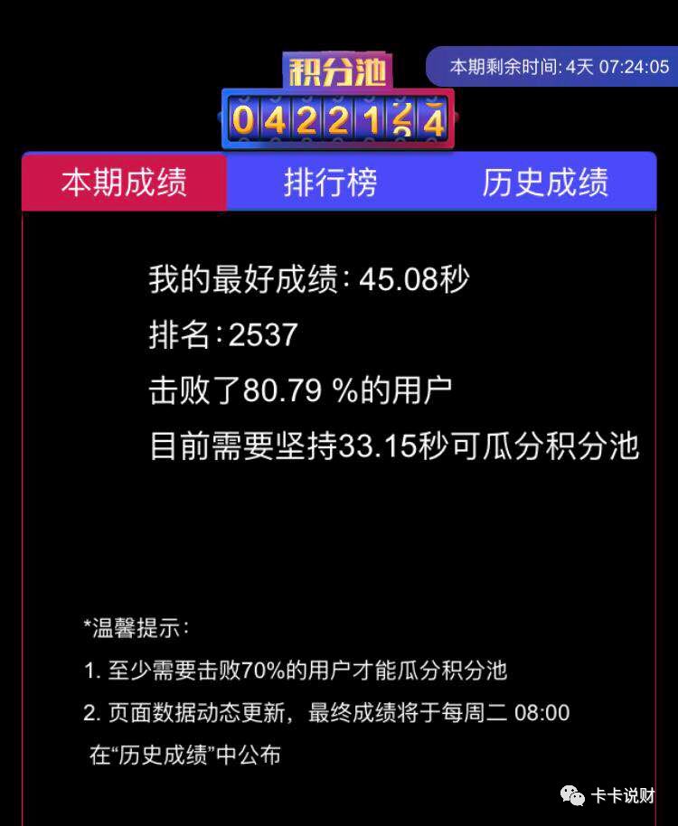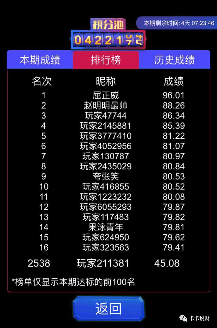 3、因为每个人可以参加多局,所以瓜分的积分并不是简单的两倍多。根据上期数据,前30%的玩家每人瓜分到手137积分。