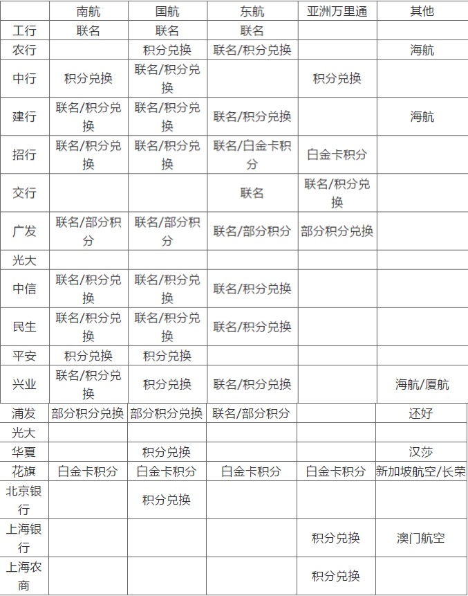 最后附上最近版上常见的各家银行能够兑换各家里程的方式: