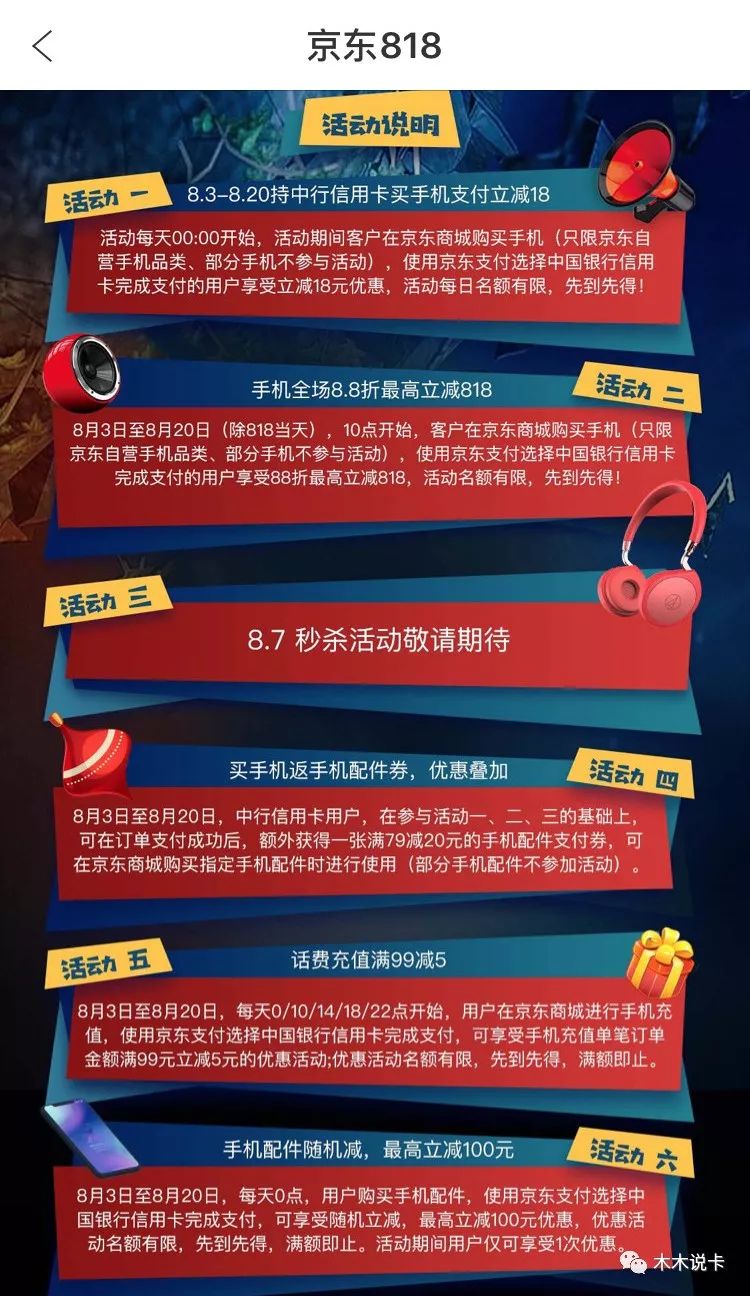 下面这个活动是京东818活动,用中行信用卡买手机有立减活动,总计5个活动,活动二的力度最大,88折直接减818元。