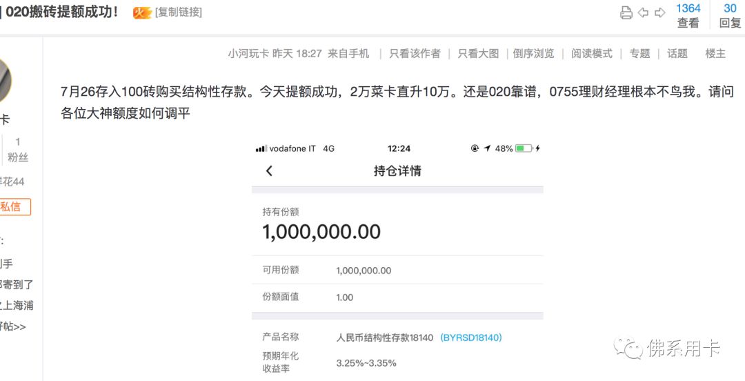 比如这位卡友存款100万结构性理财,直接提到了10万额度,看发帖的内容。理财经理...确实很重要,小默就被坑过一把,大家切记切记。