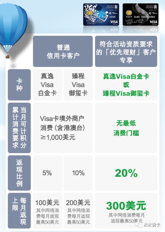 渣打优先理财持卡人,可享受20%境外消费返现活动,无最低消费门槛,无地区限制,笔笔返现,最高返现300美元..活动力度很大。