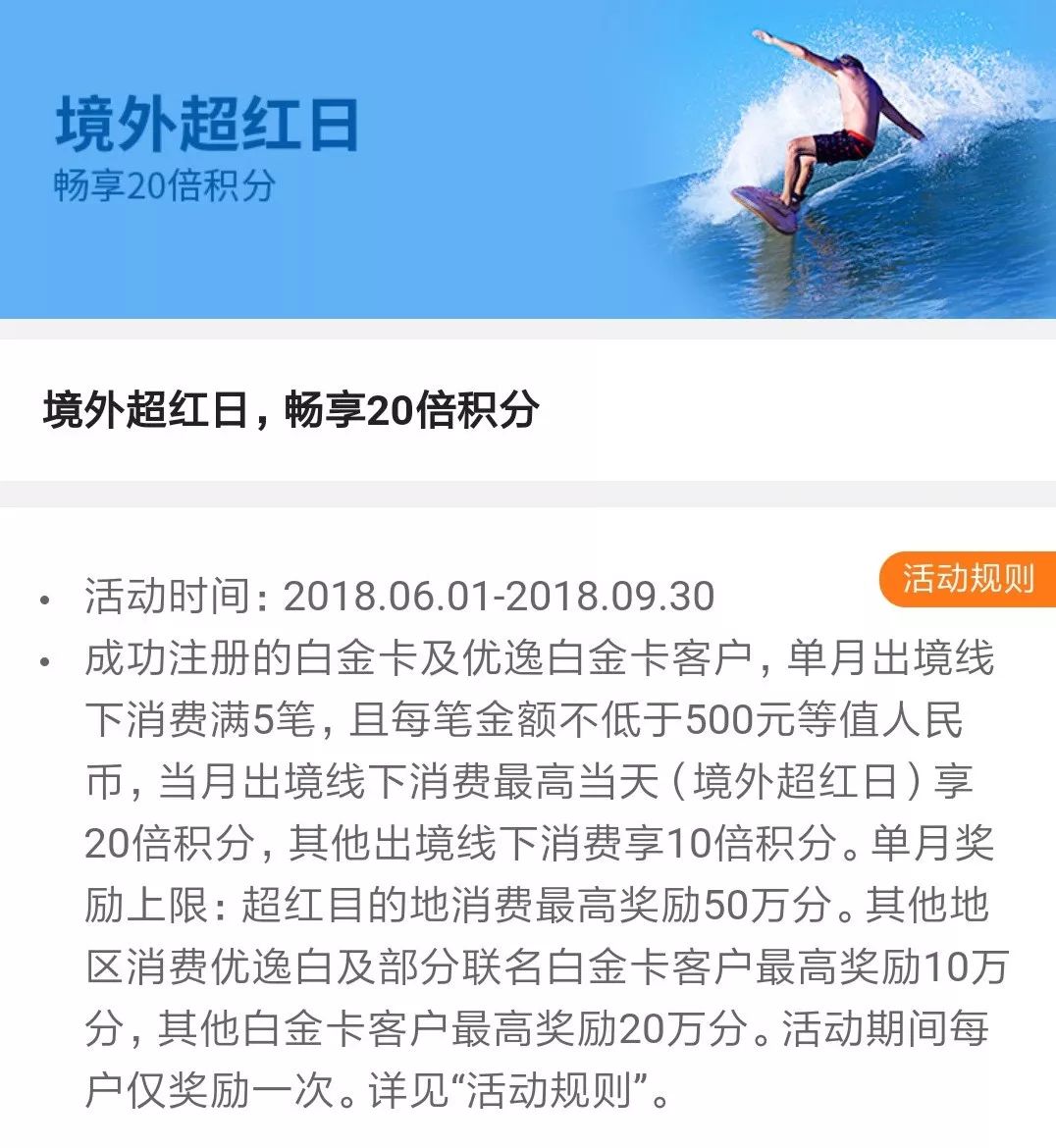 境外消费20倍积分活动。活动规则自从更新后,木木没有提过他,不过这20万、50万积分,对于里程需求高的持卡人还是值得推荐的。