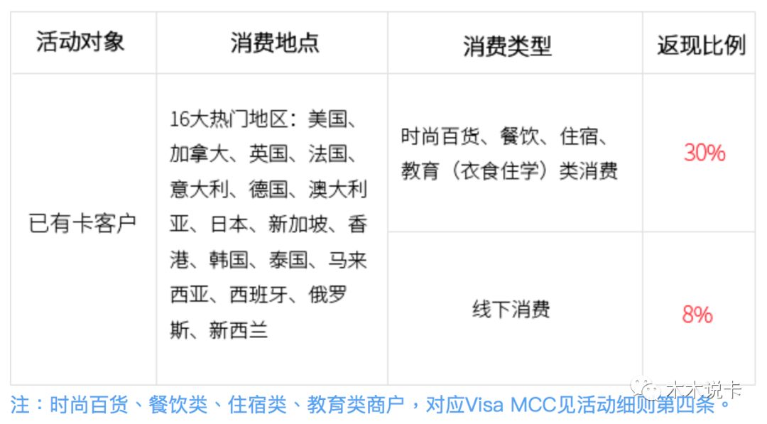 每个卡组织有对应的消费地点和消费类型指定,返现比例按商户、和境外线下返现比例算的。比如visa卡只能中信Visa Signature卡(含signature级别联名卡)、Visa白金双币卡、Visa无限卡参与。活动地址和返现比例如下: